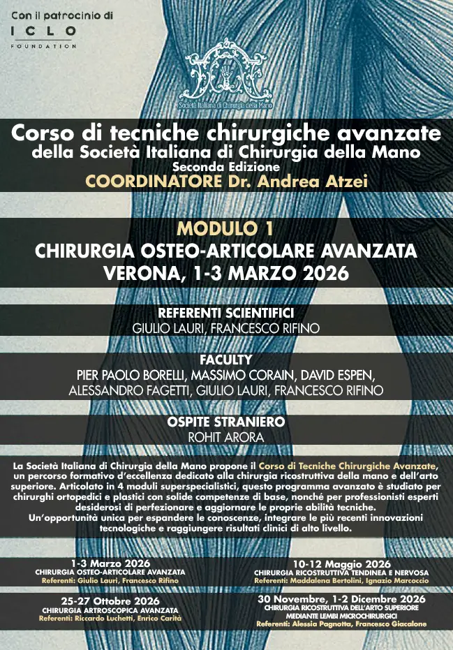 Corso di tecniche chirurgiche avanzate della Società Italiana di Chirurgia della Mano - Modulo 1 CHIRURGIA OSTEO-ARTICOLARE AVANZATAVerona, 1 - 3 marzo 2026Evento SICM Maggiori dettagli e iscrizione primo modulo: https://iclo.eu/courses/sicm-1-modulo-chirurgia-osteo-articolare-avanzata/Save the date 2026