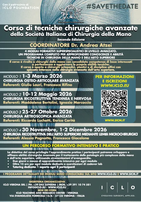 Corso di tecniche chirurgiche avanzate della Società Italiana di Chirurgia della Mano - Modulo 4 CHIRURGIA RICOSTRUTTIVA DELL’ARTO SUPERIORE MEDIANTE LEMBI MICROCHIRURGICIVerona, 30 nov - 1 - 2 dicembre 2026Evento SICM Maggiori dettagli: TBDSave the date 2026